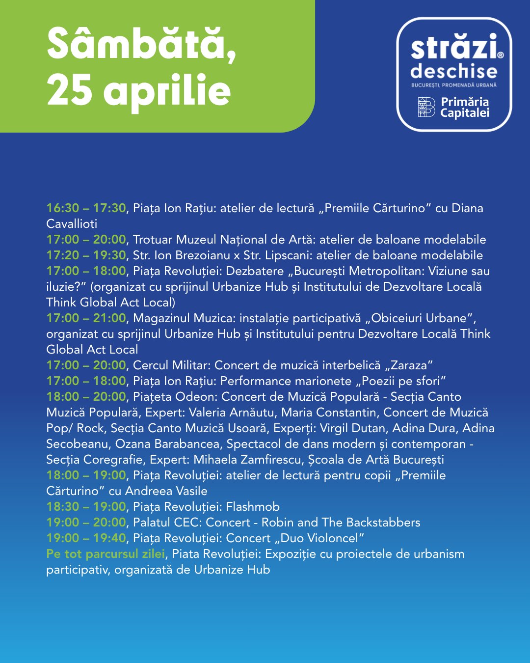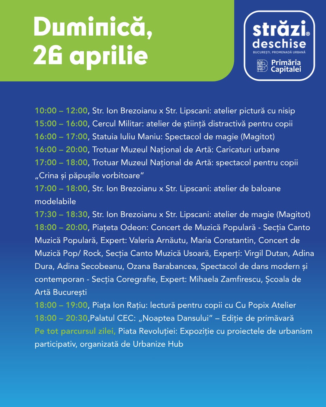 Străzi deschise în Capitală revine din acest weekend, iar în zilele de 25 și 26 aprilie sunt anunțate evenimente de dimineață până seară.